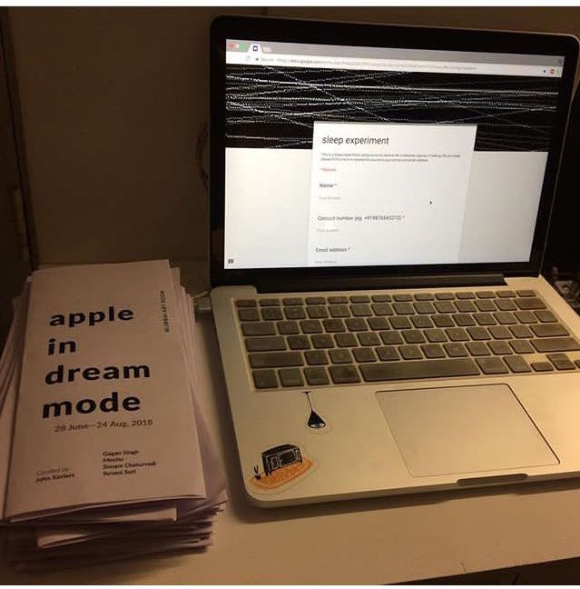 This project was created for the show apple in dream mode curated by John Xaviers at Mumbai Art Room. It is a sleep experiment only accessed by people visiting the gallery where they fill a Google form in a laptop. The form requires to fill-in their contact number, e-mail ID, sleep timings and other details related to their sleeping habits. They receive the sound work on their phone through an automated calling system, which calls them at their particular sleeping time filled in the form. Here, the sound becomes an artwork which the listener experiences in their personal space outside the boundaries of the art space.