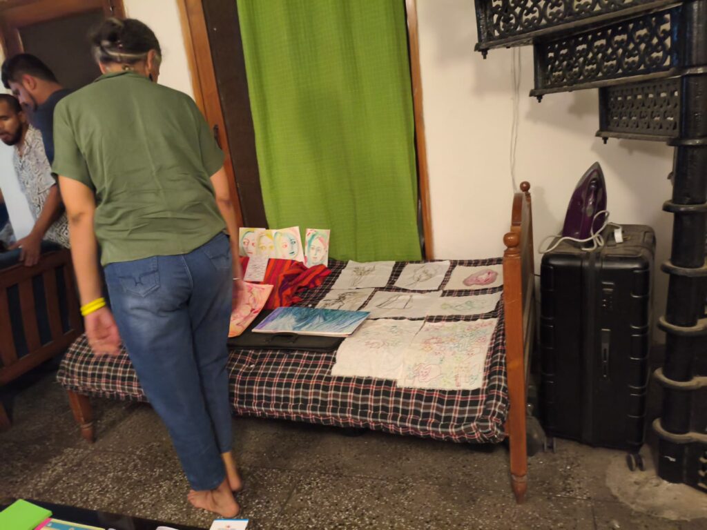 Each artist discuss about the works, Arindam laid his paintings and ongoing sketches onto the floor, tables and bed; Maithili displayed her prints on the walls and also held a reading of her artist’s book as a performative element during the presentation; Pavni took us through her research into artists’ associations and networks from the standpoint of working at Goethe-Institut, instead of showing previous work she wanted to get an understanding and discuss around her interest and what directions she could take.